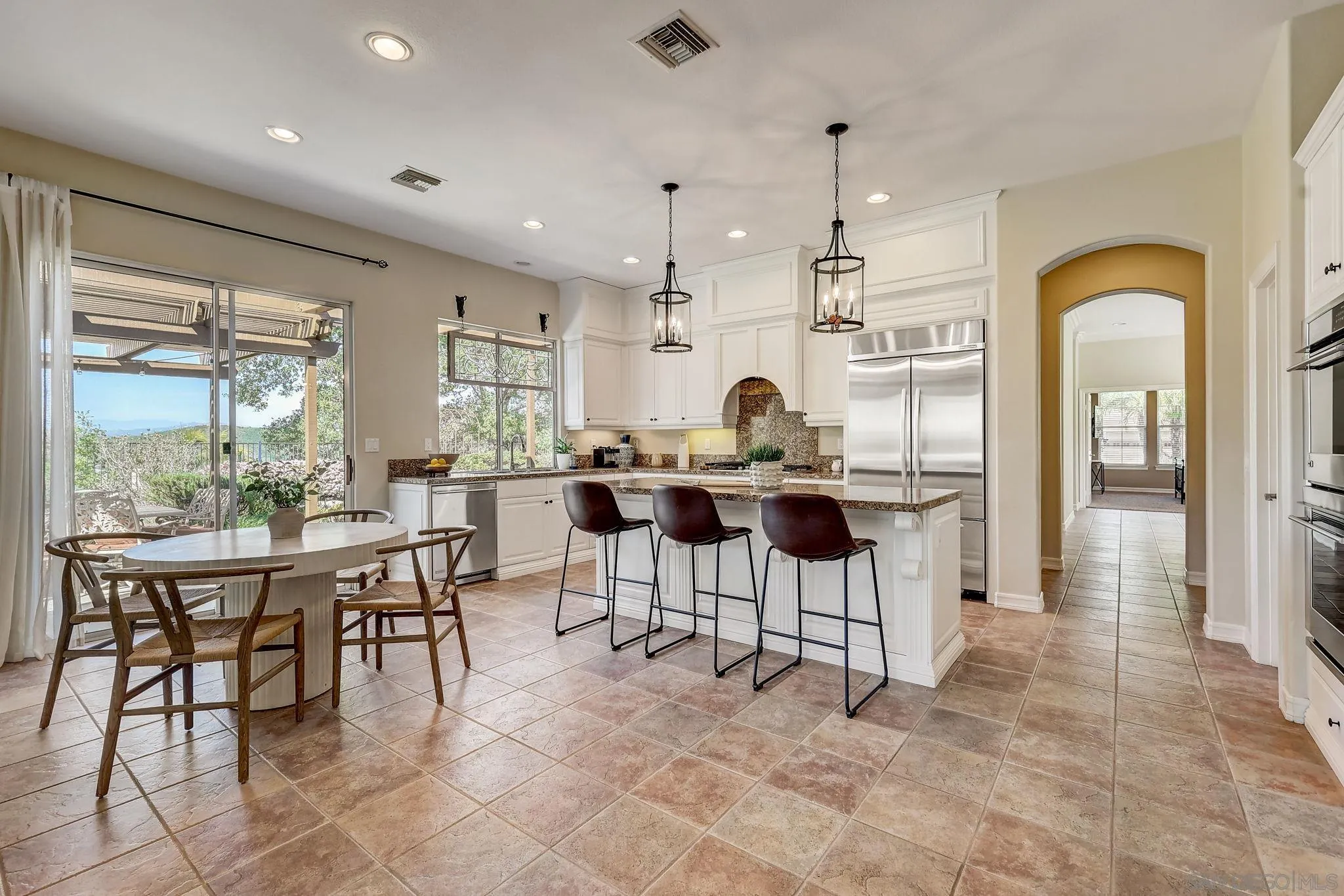 Amazing opportunity to own one of the most desirable homes in Rolling Hills Estates! Completely updated, private, SINGLE LEVEL home, nestled into a coveted, thoughtfully landscaped lot with a pool/spa, multiple garden, grassy and sitting areas and peaceful mountain views! The courtyard entry welcomes you to the formal living spaces that immediately draw you outside to the covered lanai, lush gardens with fruit trees and relaxing pool/spa area. Dine alfresco and take in the mountain views from the kitchen veranda. This spacious home offers a flexible floor plan that adapts easily for today's buyer including formal living and dining rooms, a generously sized family room, adjoining kitchen and dining area, oversized primary retreat, a second primary suite plus 2 more additional bedrooms, an optional office/5th bedroom, a separate homework/office area, oversized laundry room and a large 3 car garage with tons of storage! Entertaining will be a delight with the grand living room and cozy fireplace, stunning remodeled kitchen featuring custom cabinetry, large center island with breakfast seating, stainless appliances, both a walk-in and butler's pantry plus a dining area and adjoining family room with a fireplace and custom cabinetry - all taking full advantage of incredible indoor/outdoor living! The generously sized primary retreat also joins the lanai and offers a spa-bath with a soaking tub, shower and walk-in closet with California closet system. Designer finishes throughout. Salt water PebbleTec pool & spa! Fully paid solar for both the home & pool! Incredible location!